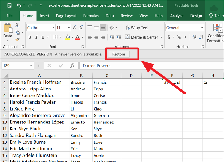 When the autosaved version of the document opens up, you will see a prompt bar (AUTORECOVERED VERSION) above your spreadsheet as shown below. Click the ‘Restore’ button in the prompt bar to revert to the previous version.