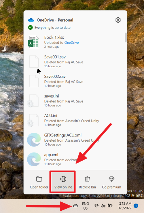 First, open OneDrive by clicking the OneDrive icon in the taskbar corner and clicking the ‘View online’ button. Or you can go to: https://onedrive.live.com.