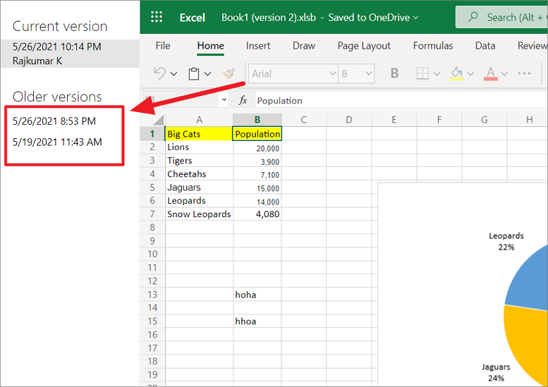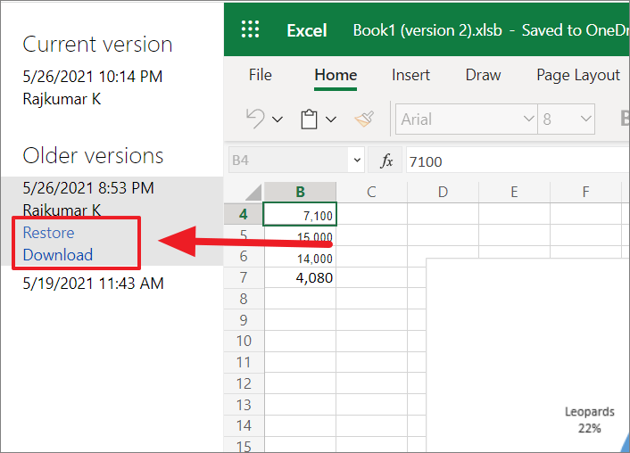 Now, simply click on the version you want to restore from the list of versions and it will open the document in the Excel window (as shown below).