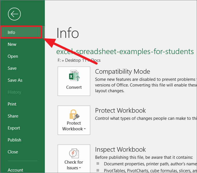 First, open the Excel Work for which you want to restore the previous version and click the ‘File’ tab. Then, choose ‘Info’ on the left-hand pane.