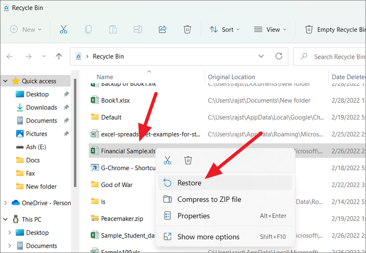 Open the Recycle Bin on the desktop and locate the file you want to retrieve. Then, right-click on the deleted Excel file and select the ‘Restore’ option to restore it back to its original location.