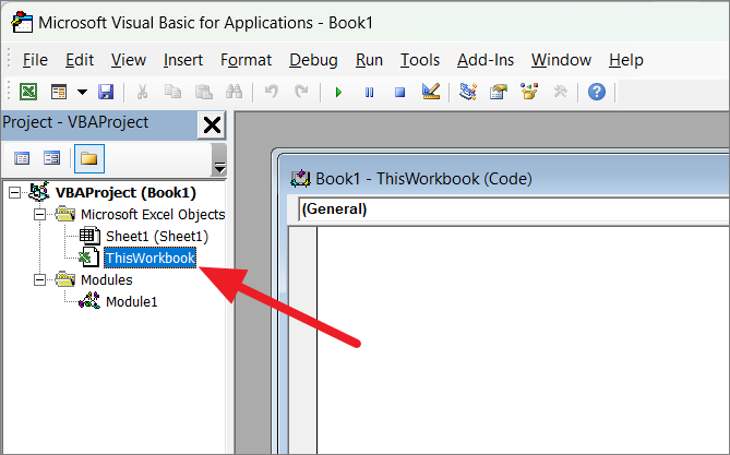 This will open Microsoft Visual Basic for Applications window. Here, double click on the ‘This Workbook’ object in the project explorer (left-hand navigation panel).