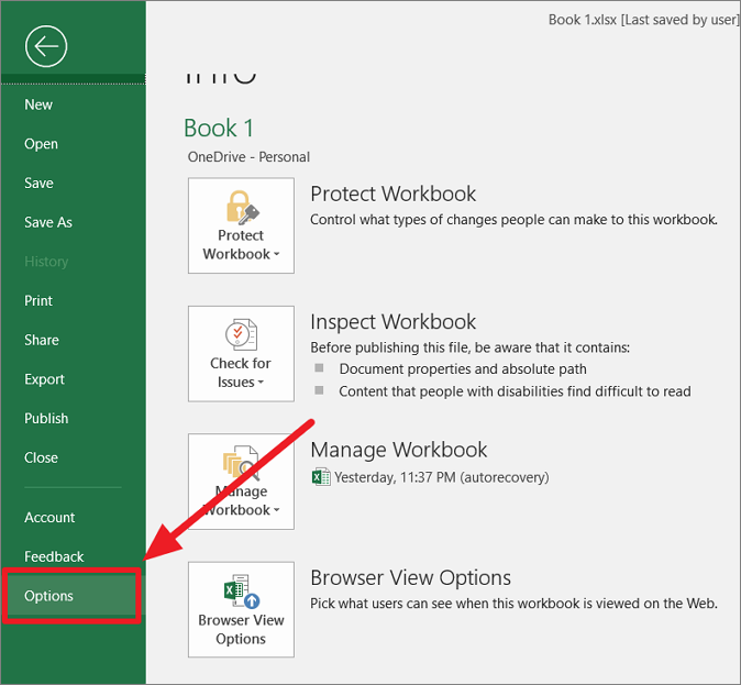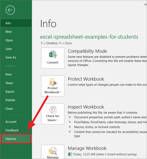First, open the Excel program and go to the ‘File’ tab. From the backstage view left panel, select ‘Options’.