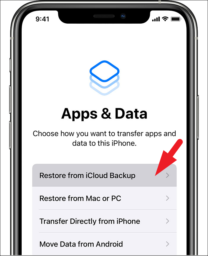 Once the iPhone restarts, go through the initial setup, and once you reach the ‘Apps & Data’ screen, tap on the ‘Restore from iCloud Backup’ option to continue.