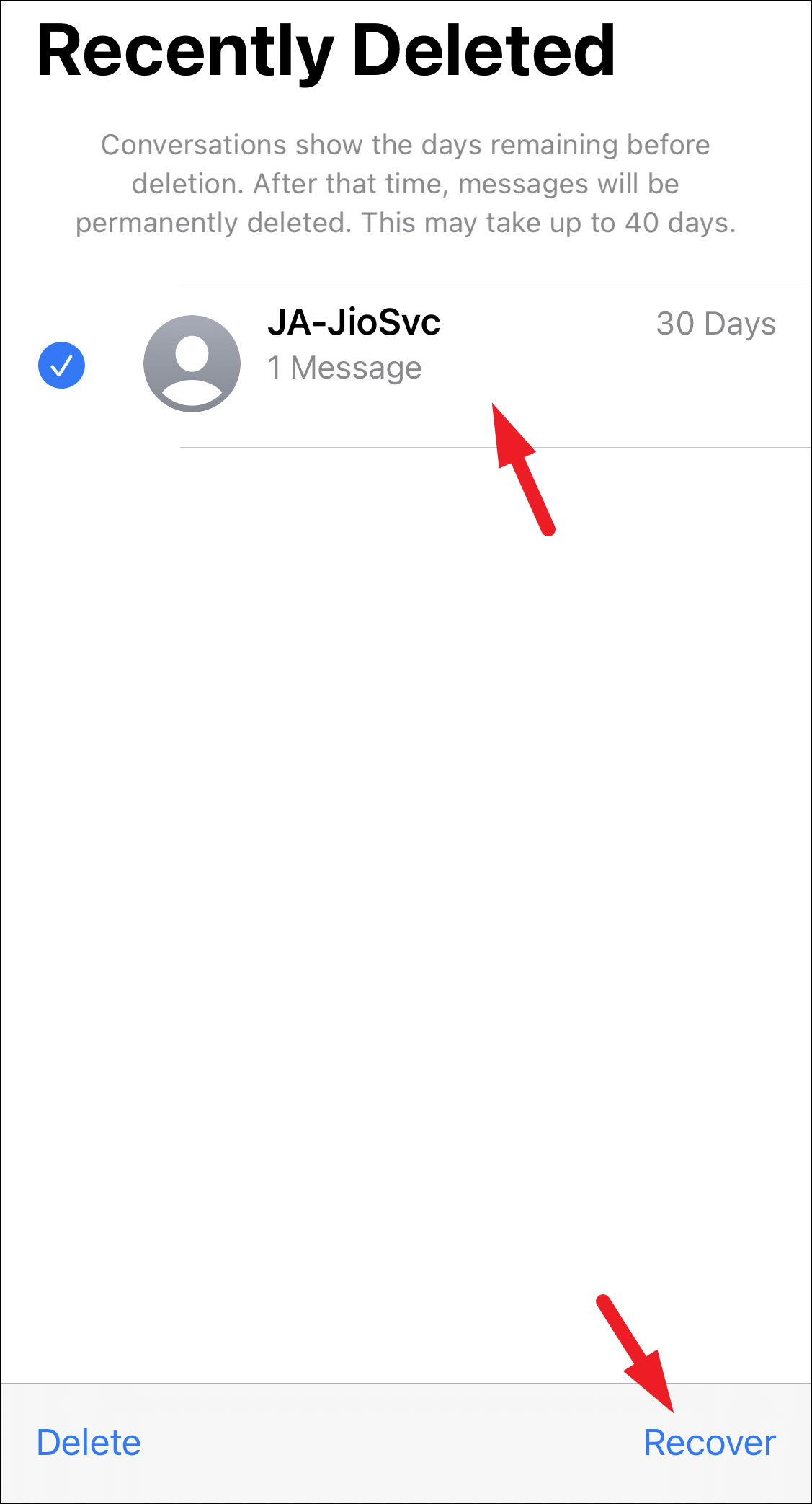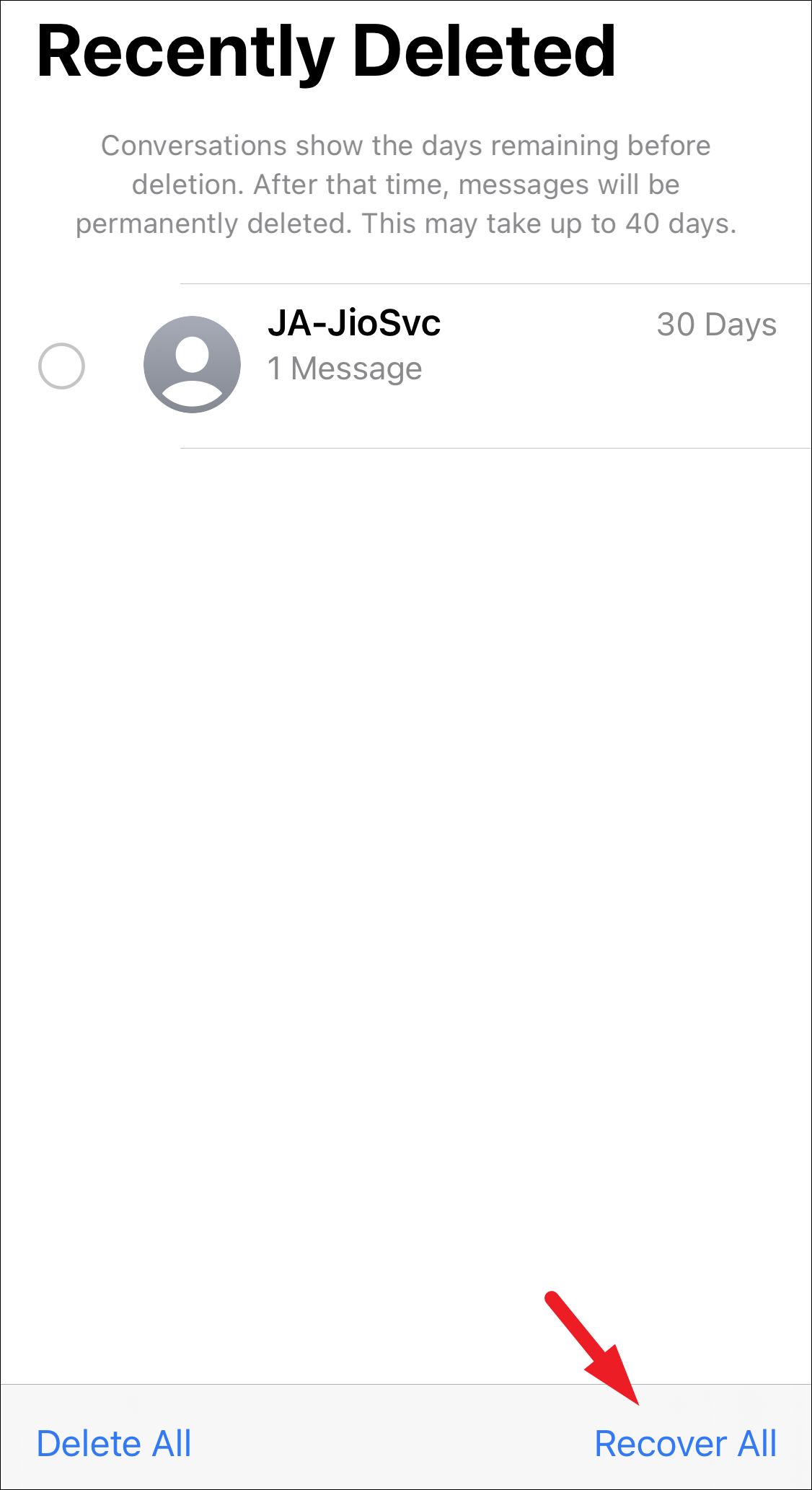It’ll have all the messages you deleted in the past 40 days. You cannot open a message from here without recovering it first. If you wish to recover all the messages present in the section, tap on the ‘Recover All’ button from the bottom right corner.
