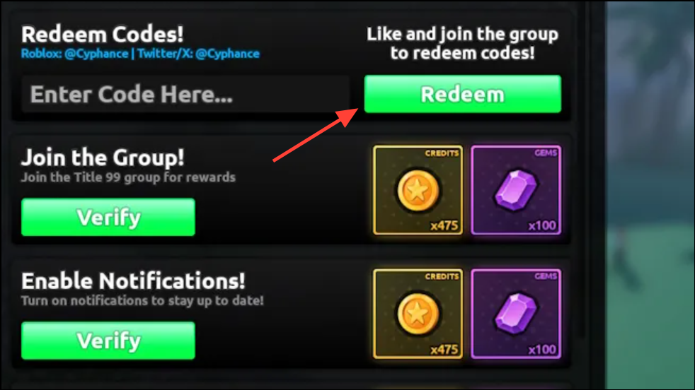 Step 7: Click the Redeem button. After entering the code, press the green “Redeem” button. If the code is valid and active, your rewards will be credited to your account instantly. If you receive an error, double-check for typos, confirm group membership, or try rejoining the game to refresh your session.
