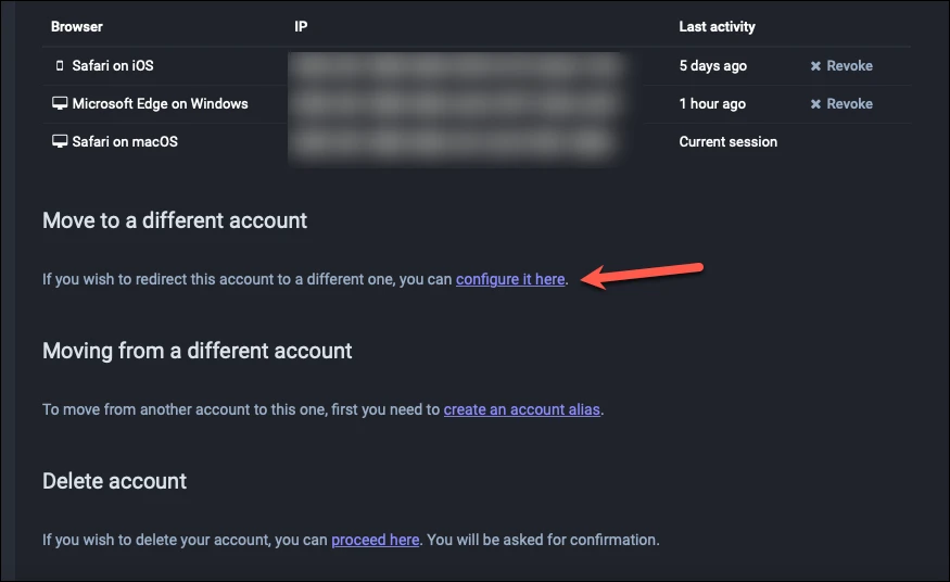 Then, scroll down and click the ‘configure it here’ link under ‘Move to a different account’.