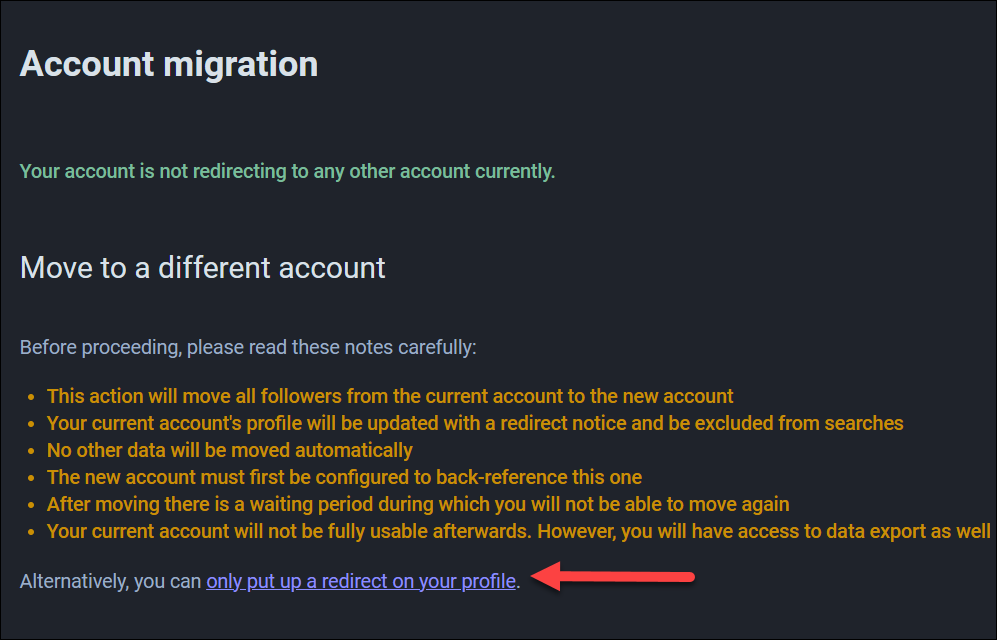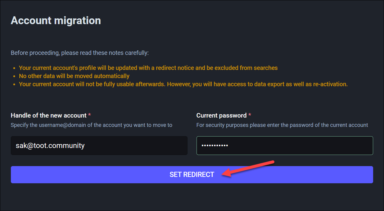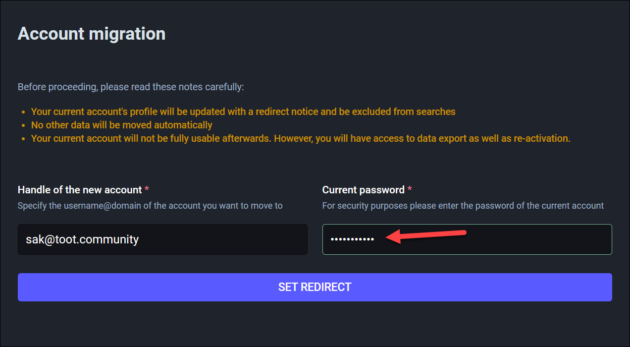 Enter the complete handle of your new account where you want to redirect your current account. We’re assuming you already have your new account set up. If you don’t, first create a new account on either the same or another server you want to join. Now, enter the complete handle of your account, with the server’s domain, even if your new account is on the same server as your current one.