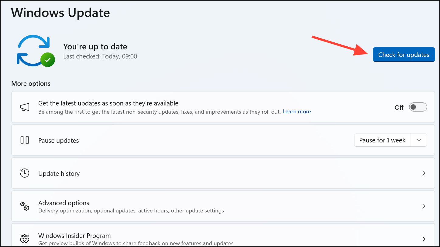 Step 8: Finally, navigate back to Settings > Windows Update and click "Check for updates" to ensure your system has the latest updates.