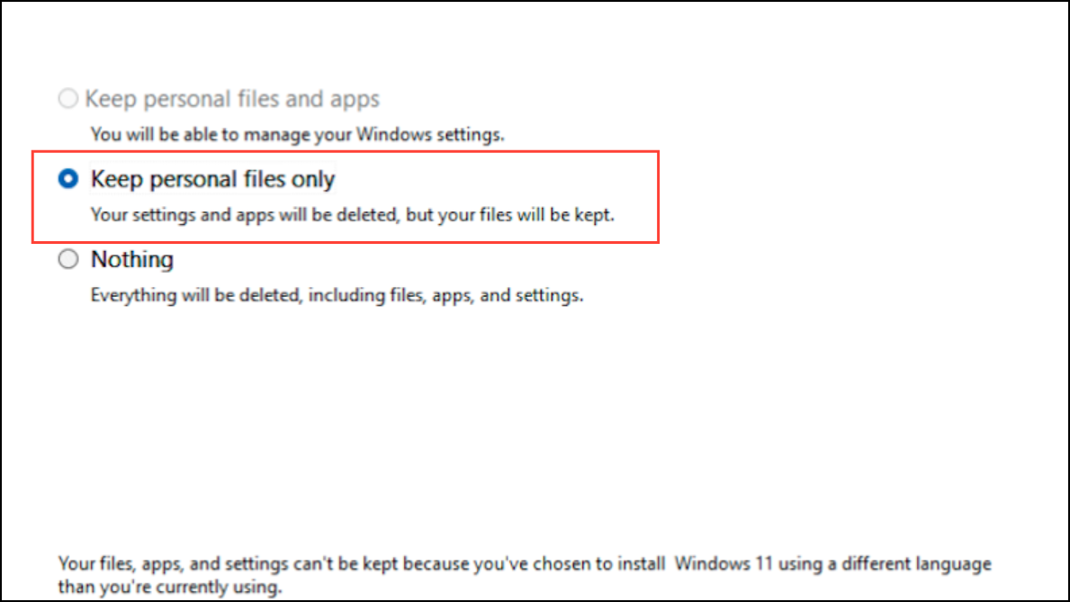 Step 2: In the popup window, select "Keep my files". Windows will then display a summary of what will be removed and retained.