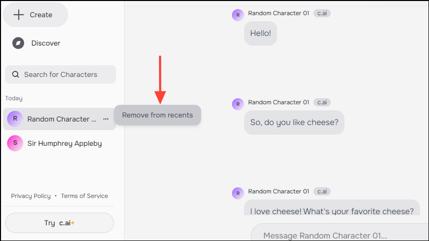 - Then click on 'Remove from recents'. However, doing so will not permanently delete the character but only remove it from your recent chats.