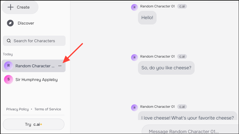 - You will see the characters and their chats on the left. Hover the cursor next to the name of the character you want to delete and click on the three dots that appear.