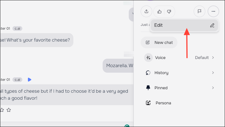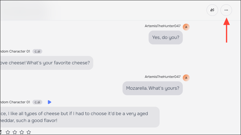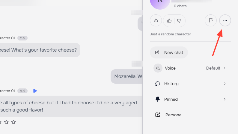 - Open the chat for the AI character you want to delete and click on the three dots on the top right.