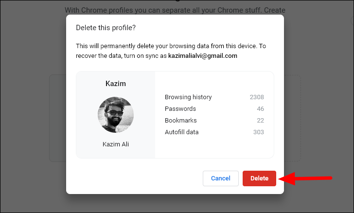 A confirmation box will show mentioning the data that would be deleted from your device on removing the profile. Click on ‘Delete’ at the bottom-right of the confirmation box to confirm removing the profile as well as the associated Google account.