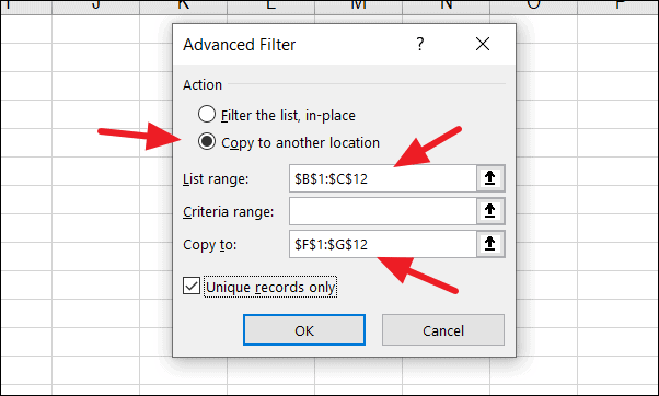 Step 3: In the Advanced Filter dialog box, choose Filter the list, in-place to filter the existing range. Check the box for Unique records only and click OK.