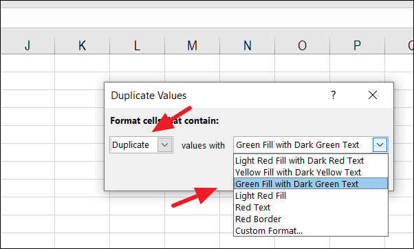 Step 3: In the Duplicate Values dialog box, choose whether you want to highlight duplicates or unique values. Select Duplicate in the first drop-down menu. In the second drop-down, pick the formatting style you prefer to highlight the duplicates. Click OK to apply.