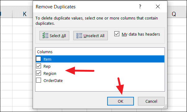 Step 3: The Remove Duplicates dialog box will appear, displaying the list of columns in your dataset. Check the boxes next to the columns where you want to look for duplicates. If your data has headers, ensure the My data has headers option is selected. Once you've made your selections, click OK.