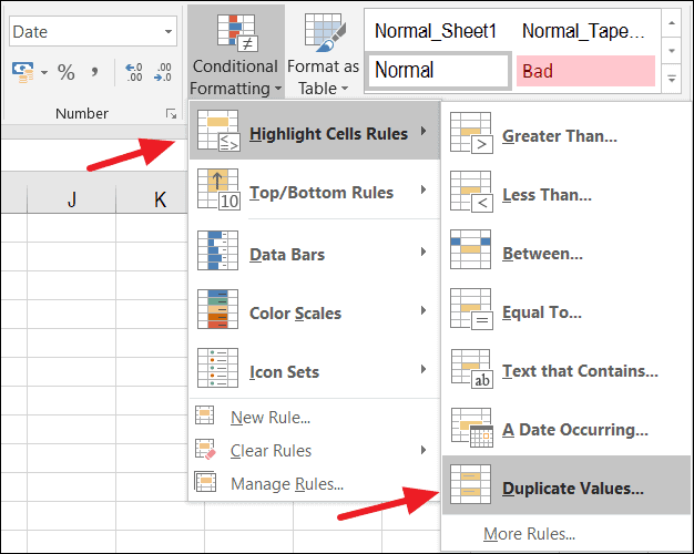 Step 2: Go to the Home tab, click on Conditional Formatting, hover over Highlight Cells Rules, and then select Duplicate Values...