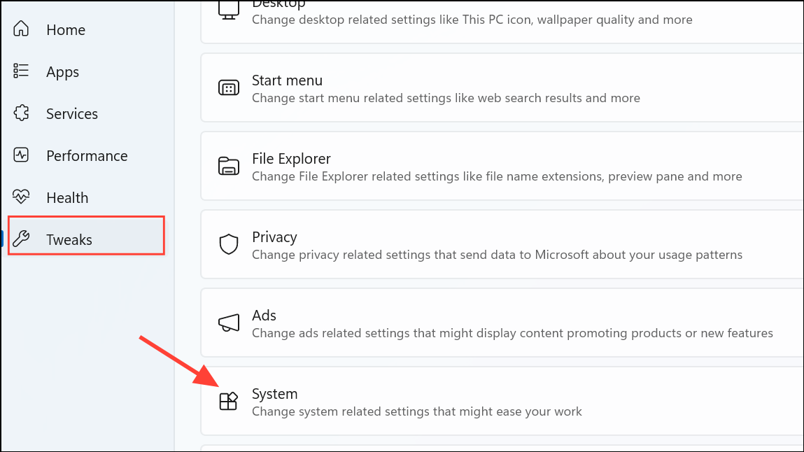 Step 2: After installation, launch Wintoys from your Start menu or desktop. Upon opening, you'll see a redesigned welcome screen with clear navigation options. On the left sidebar, click on "Tweaks," then select the "System" category.