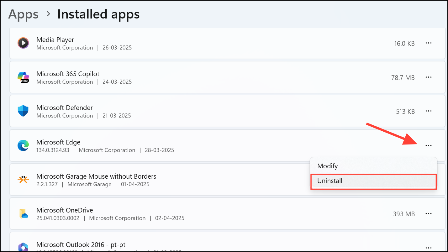 Step 5: Click on the three-dot menu next to Microsoft Edge and select "Uninstall." A confirmation prompt will appear; confirm that you wish to uninstall Edge. Windows will now initiate the official uninstallation process, removing Edge completely from your system.