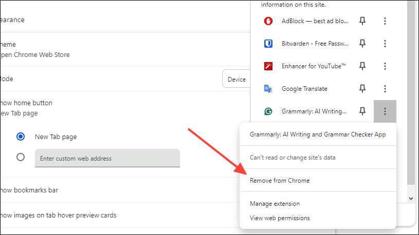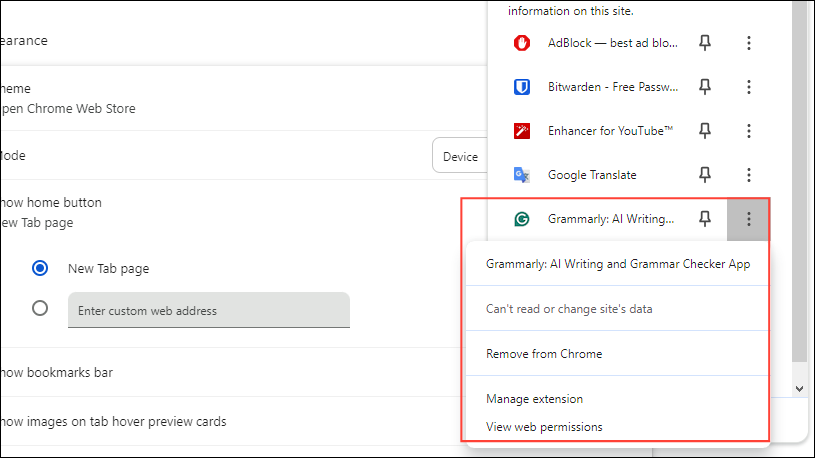 - Click the three dots next to the Grammarly extension, and you will see various options associated with it.