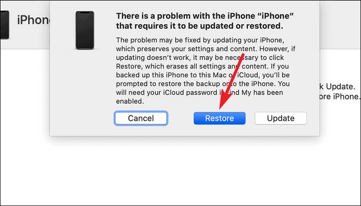 A message will appear on your iTunes saying that there is a problem with your iPhone. You’ll see the options for ‘Cancel’, ‘Restore’, or ‘Update’ on your computer screen. Click the ‘Restore’ button.
