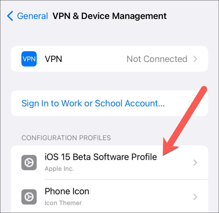 Under the ‘Configuration Profiles’ section, you’ll see all downloaded profiles if there is more than one on your iPhone. Tap on the ‘iOS 15 Beta Software Profile’ option to continue.