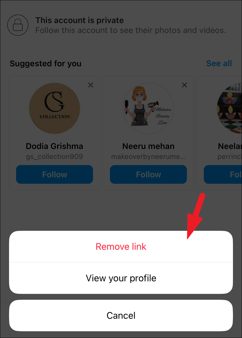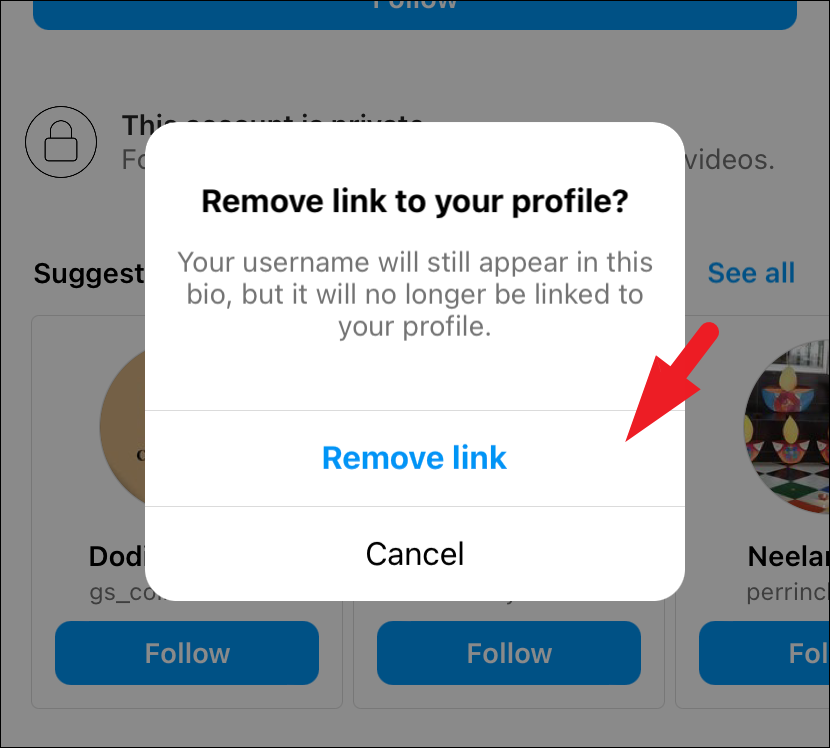 Finally, tap on the ‘Remove link’ option. The other person will not receive any notification regarding you removing the link on their bio. However, your profile name will still be visible as plain text.