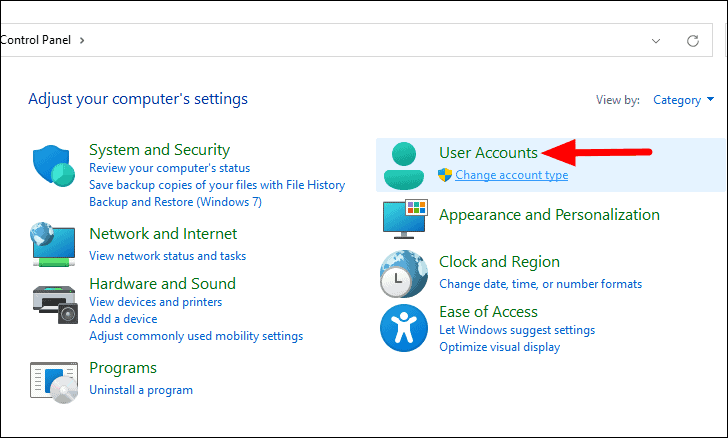 Step 2: In the Control Panel, click on User Accounts.