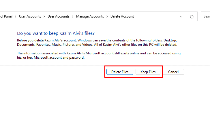 Step 6: Choose whether you want to Delete Files or Keep Files. Selecting Keep Files will save certain files associated with the account to your desktop. Make your selection to proceed.