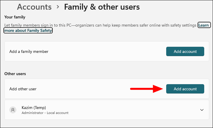 Step 4: Under the Other users section, click on Add account next to Add other user.