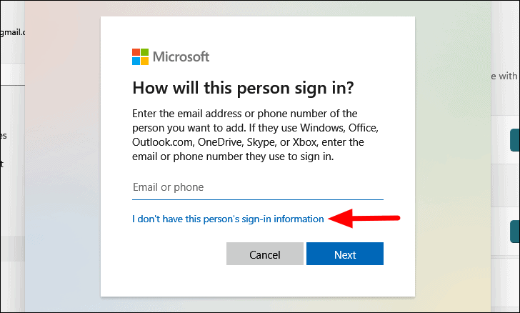 Step 5: In the Microsoft account window that appears, select I don't have this person's sign-in information.