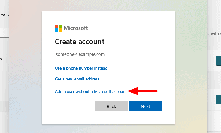 Step 6: Choose Add a user without a Microsoft account on the next screen.