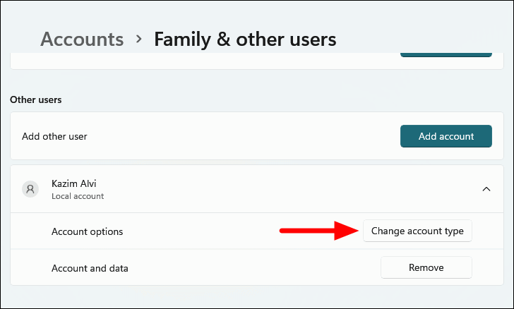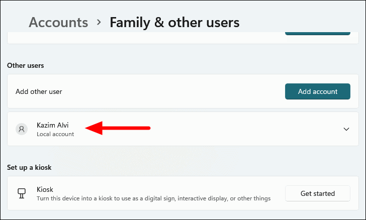 Step 8: The local account is now created but is a standard user by default. To assign administrative privileges, click on the newly created account under Other users.
