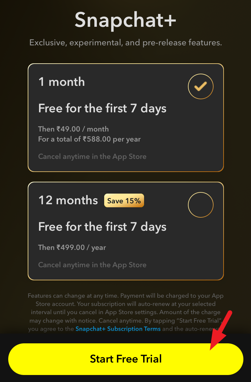You can either choose to pay monthly or yearly. Once selected, tap 'Start Free Trial' and complete the payment.