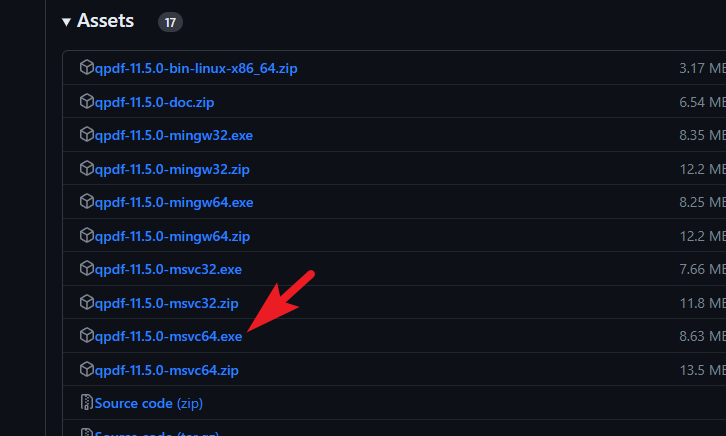 First, navigate to github.com/qpdf in your preferred web browser. Download the appropriate installer based on your system architecture: click on qpdf-msvc64.exe for 64-bit Windows or qpdf-msvc32.exe for 32-bit Windows.