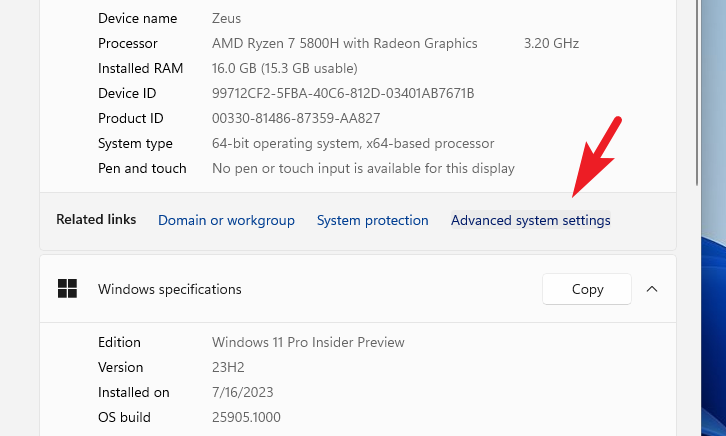 Click on ‘Advanced system settings’ to open the System Properties window.
