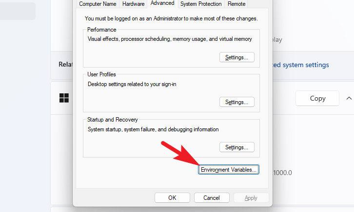 In the System Properties window, under the ‘Advanced’ tab, click on ‘Environment Variables’.