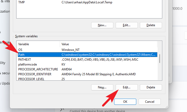 Under ‘System variables’, find and select the ‘Path’ variable, then click ‘Edit’.