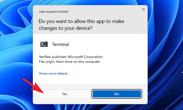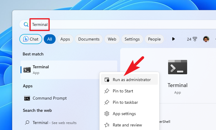 Open an elevated Terminal window by searching for ‘Terminal’ in the Start Menu, right-clicking on it, and selecting ‘Run as administrator’.