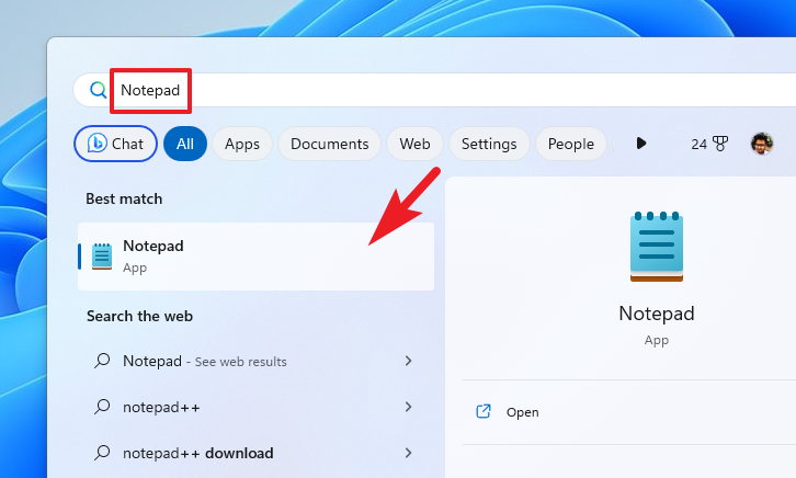 Open Notepad by searching for it in the Start Menu and clicking on the application.