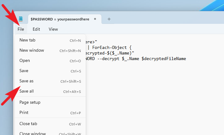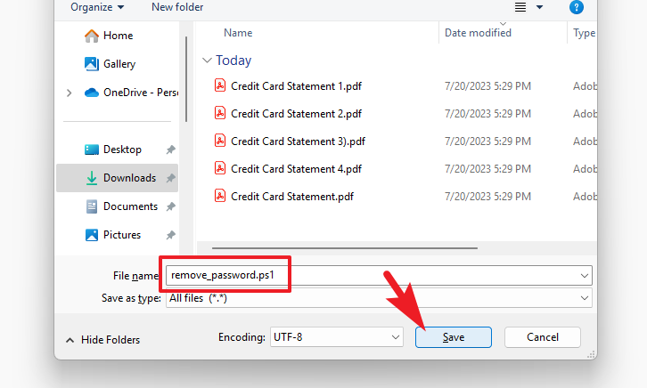 In the Save dialog, navigate to the folder containing your PDF files. Save the file with a .ps1 extension, such as decrypt.ps1.