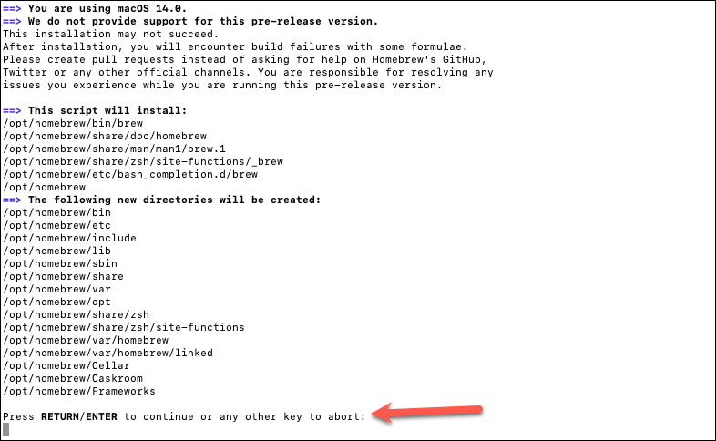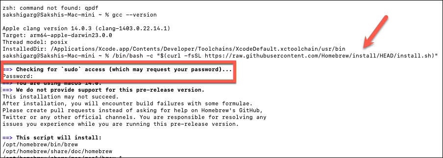 /bin/bash -c "$(curl -fsSL https://raw.githubusercontent.com/Homebrew/install/HEAD/install.sh)"Enter your user password when prompted (note that the Terminal doesn't display characters as you type your password). Press Enter to proceed with the installation.