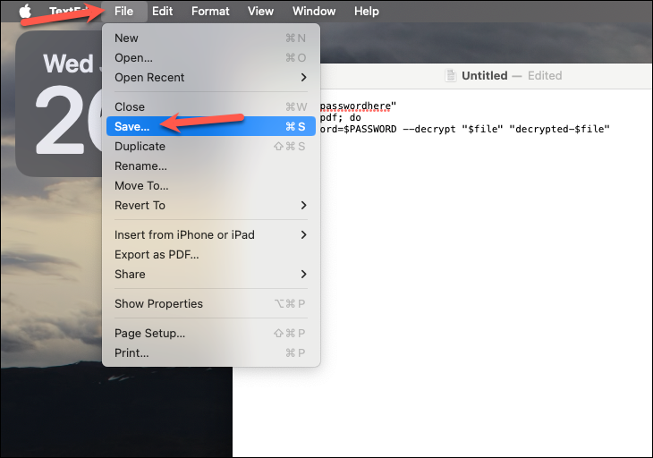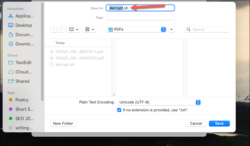 Name the file with a .sh extension, such as decrypt.sh, and save it in the same folder as your PDFs. Uncheck the ‘If no extension is provided, use ".txt"’ option if it's selected.