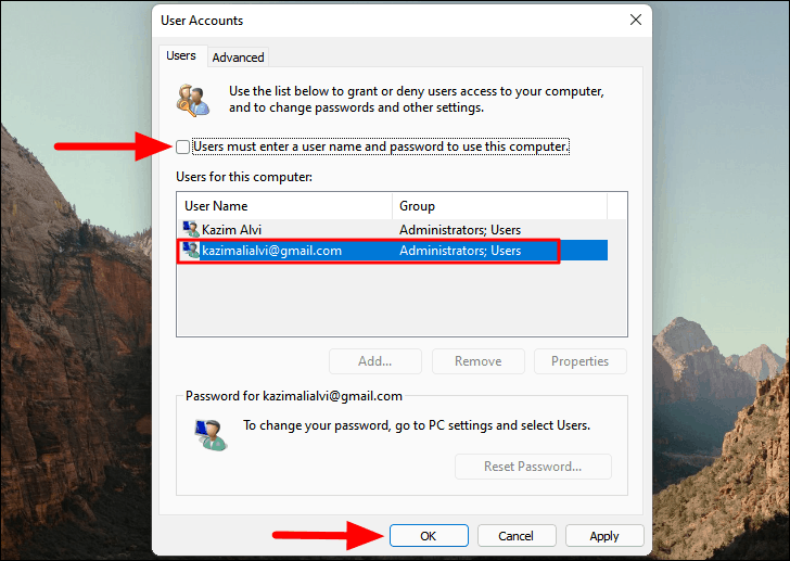 - Uncheck the box next to Users must enter a user name and password to use this computer.