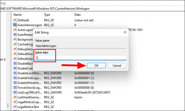 AutoAdminLogonstring and change the Value data to1. Click OK.