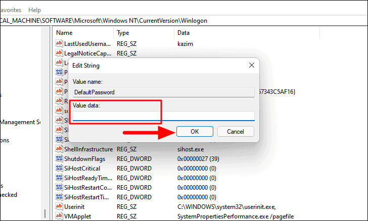 DefaultPasswordstring and enter your account password in the Value data field. Click OK.