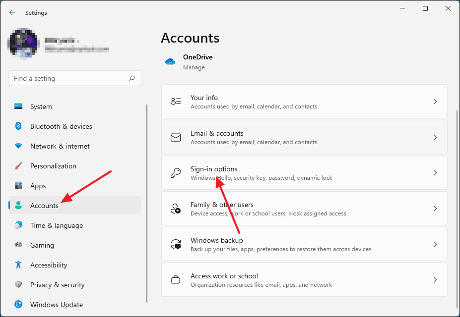 Step 2: In the Settings window, select Accounts from the left sidebar, then click on Sign-in options on the right.