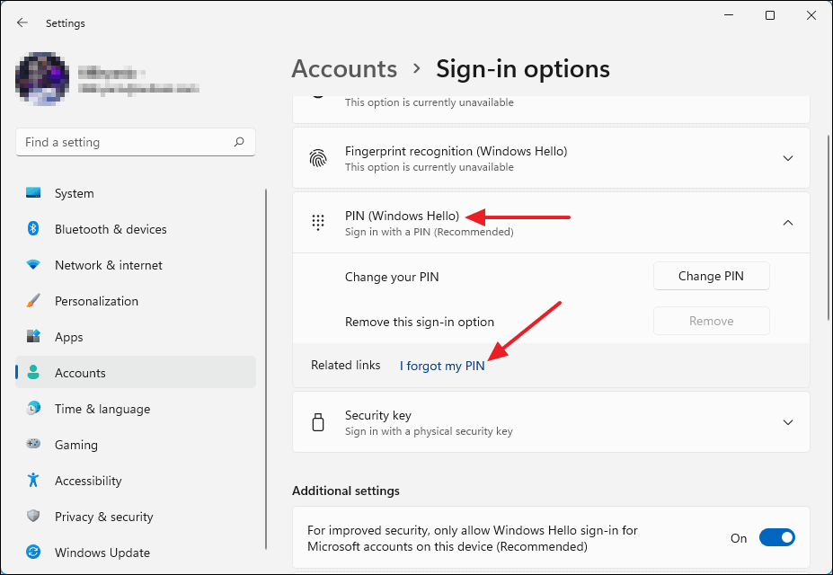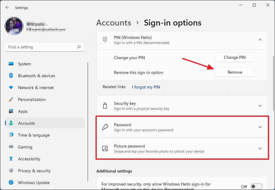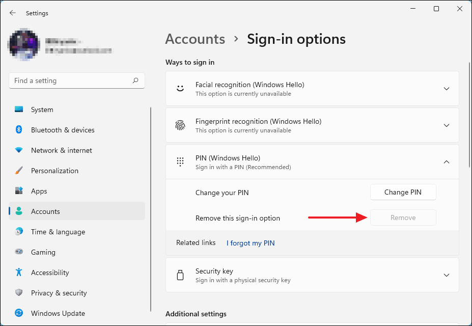 Step 6: Reopen the Settings app, navigate back to Accounts > Sign-in options > PIN, and you will now find that the Remove button is clickable.