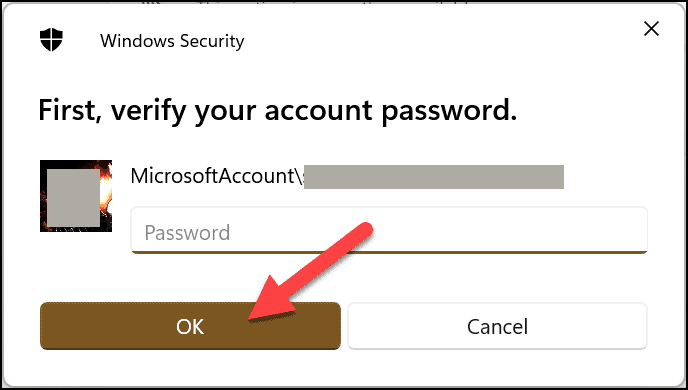 Step 8: Enter your Microsoft account password when prompted to authenticate the action, then click OK.